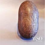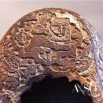 Remarque : À l’arrière est représenté « L’art Royal  » la chasse au faucon qui était réservée à la grande noblesse et aux Shah. Sur l’avant on trouve le lion symbole de l’Iran (symbole que l’on retrouve sur les anciennes pièces de monnaie d’Iran). Les côtés sont ornementés d’oiseaux et de fleurs identiques à celles que l’on trouve sur les tapis. Il s’agit d’un objet très rare.